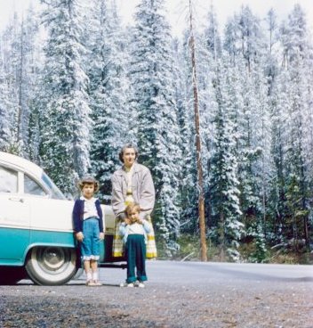 After the Tetons, we made some stops in Yellowstone. Here are three photos, which seem to be at the same rest stop, where I suspect Joan and I got our hands on snow for the first time! Note Mom's stylish oxfords....