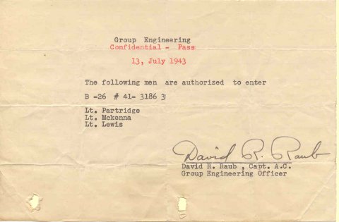 Here is an image of the pass issued to Billy and his buddies as they began their flight to England. [1] |