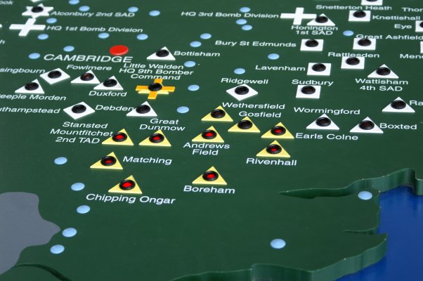 Among the many interesting displays in the Museum was this light table showing the many different bases located all over England. When you pushed the "B-26" button, the bases used primarily for these planes lit up on the map. You can see three of Billy's bases—Earls Colne, Rivenhall and Matching—named by the red lights in this photo, as well as some other locations mentioned in various Journal entries: