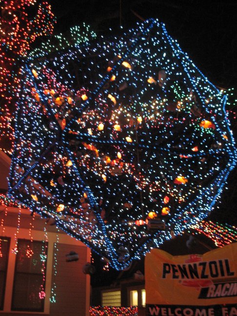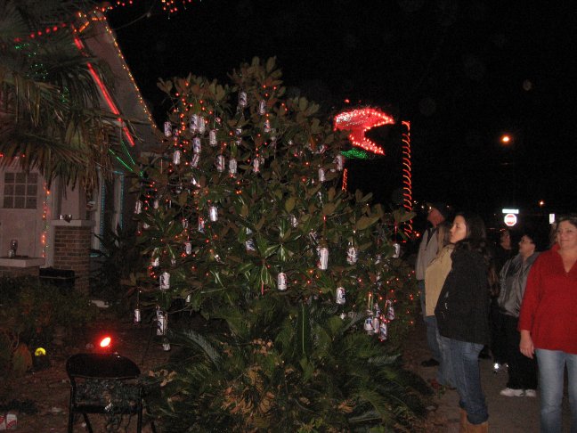 In addition to the big dinosaur and neat light-lines on the house, there was this creatively-decorated tree in the yard (the cans are all Pabst, in case you're interested) ....