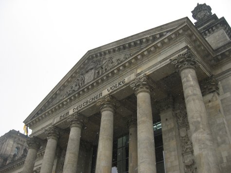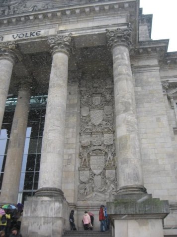 The Reichstag was our first stop, after a bus ride from the train station (not as scenic as it should have been due to condensation and precipitation on cold bus windows!). Here is Henry posed with the structure, and a couple of detail shots. In the middle you can see the sleet that kept us from staying longer to admire the impressive edifice. The legend "Dem Deutschen Volk" means "For the German People."