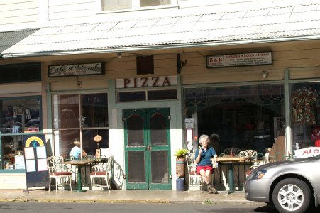 We spent an enjoyable afternoon driving from Hilo to Kailua-Kona along the northern side of the island. We took highway 19 along the coast and saw waterfalls and other scenery that we wished we had time to stop and savor. Waipio Bay, on 240, a little side road, was our main scenic stop. But we also had a delicious pizza at this restaurant in Honoka'a, town that reminded us a little of Fredericksburg. A bit later, on highway 250 that runs up the spine of the Kohala peninsula, we stopped for ice cream. Next door was this German restaurant and we had to get a picture of its sign, since Henry's great aunt is called "Aunty."