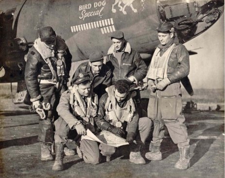 Here is a picture of Billy and his crewmates with their plane, the Bird Dog Special, at some point after their 21st mission (note the number of bombs painted on the fuselage). The men in the picture are: back row—Ehalt (engineer), Hanson (tail-gunner), Schaffert (radio operator), Enderton (pilot); front row—McAdam (bombardier) and Billy. |