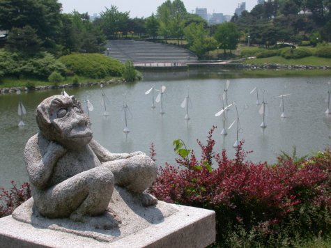 Today we spent a very nice and somewhat relaxing morning at Olympic Park (올림픽 공원) an enormous and absolutely lovely space. In addition to, of course, the huge buildings built for the 1988 games, they have scores of really interesting sculptures scattered throughout (Henry took LOTS of pictures) and dozens of lovely little seating areas in the shade where we took several nice rests—needed after all the walking involved in seeing the large space.