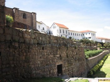 It's difficult not to get carried away by the beauty of Inka walls. Below is a shot showing some of the rougher sections of the Coricancha wall, presumeably built earlier than the smooth-fitting stonework further along: