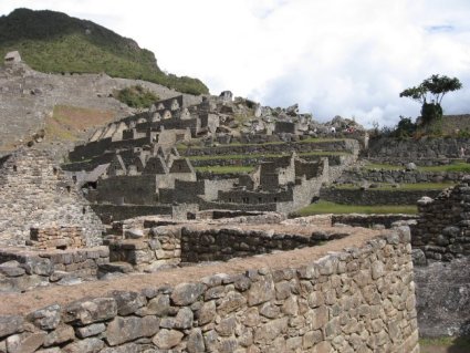 And finally here are shots looking up at the terraces and back toward the "urban sector." Note the stone "peg" jutting out from the wall on the left. We were told these features, common in this area, were used to support the buildings' roofs, although some might also have been used as astronomical sighting devices. And you might also notice the rather menacing clouds approaching from the mountains on the right. We were afraid we might be caught in a rainstorm as we left, but if it rained on Machu Picchu that day, it was after we were gone.