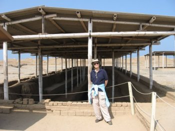 Chan Chan is an enormous archeological site near Trujillo and right on the ocean. Archeologists believe its construction was begun around 1300 A.D. by the Chimu people, who developed one of the largest pre-Inka cultures. They were eventually absorbed by the Inka empire, but it didn't seem to change their lives much. Chan Chan was definitely built on for hundreds of years. Each time a new leader took power, he built a new palace and so now the site covers 20 square kilometers of prime beachfront real estate. Only one of the palaces is open to the public and the archeologists are still working on it. ChanChan is considered to be the largest complex of mud structures in the world, and we believe it. You would think that mud buildings wouldn't last long so near the ocean, but the weird weather of the Peruvian Pacific coast allows it, since it hardly every really rains here!